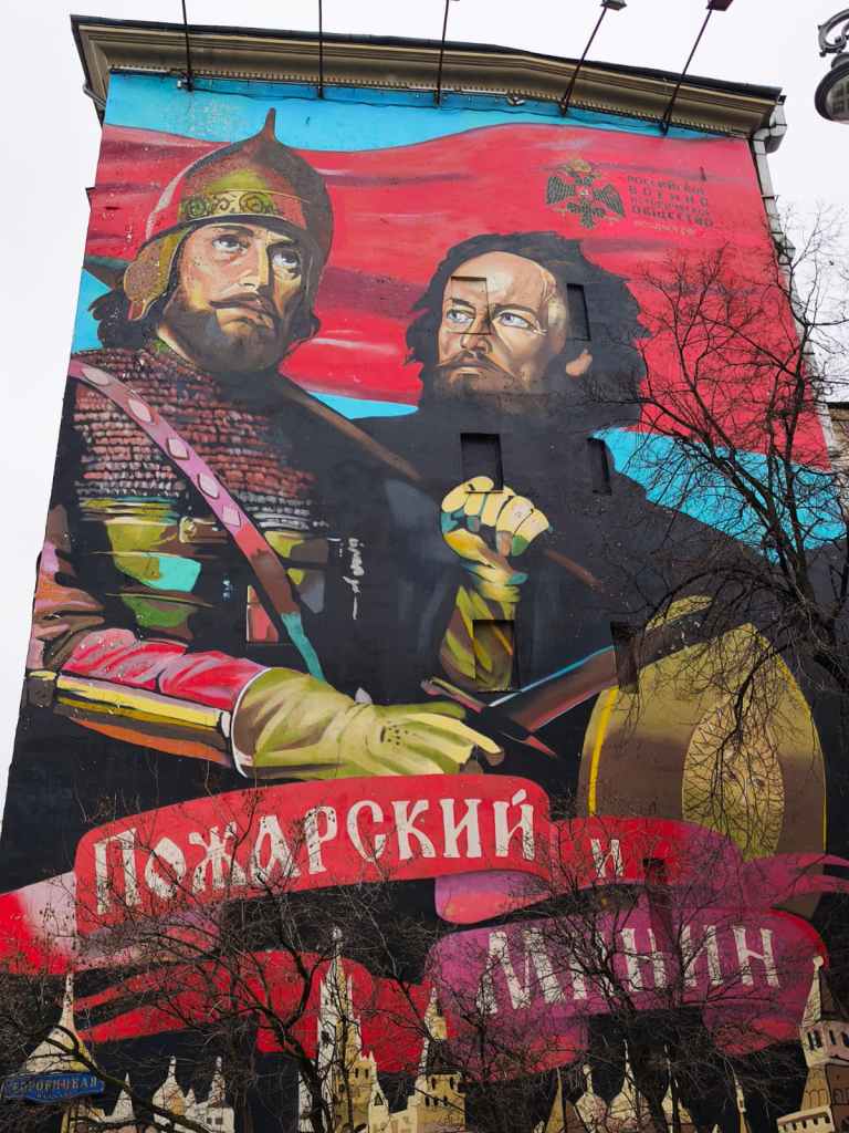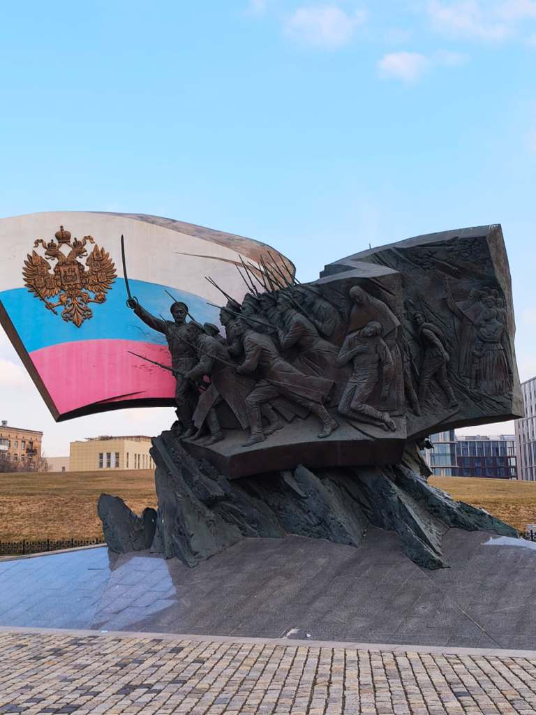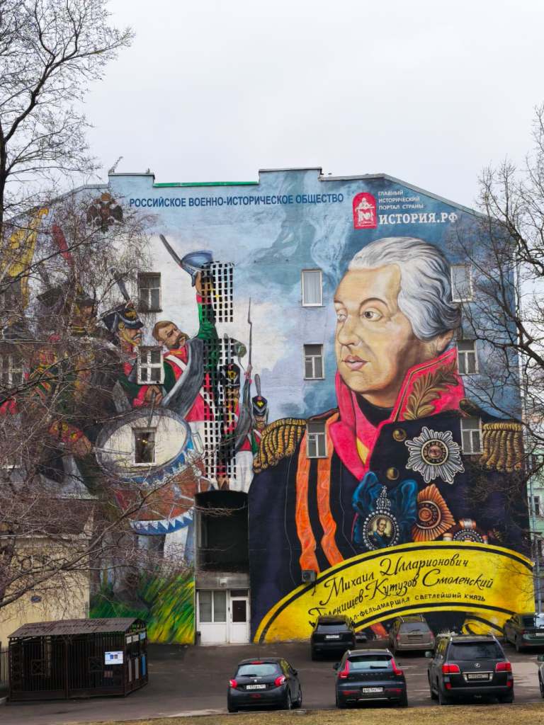 Before moving on to other museums or sights in Moscow, let’s talk about the war. One thing a visitor nowadays can observe in Moscow is that the city is filled with patriotic/nationalistic murals and recruitment posters on the billboards. On Old Arbat Street, I saw eye-level posters commemorating the anniversary of Crimea’s annexation, or as they call it, its reunion with Russia. Near the statue of Vladimir the Great, entire building façades are covered in giant patriotic murals like these: